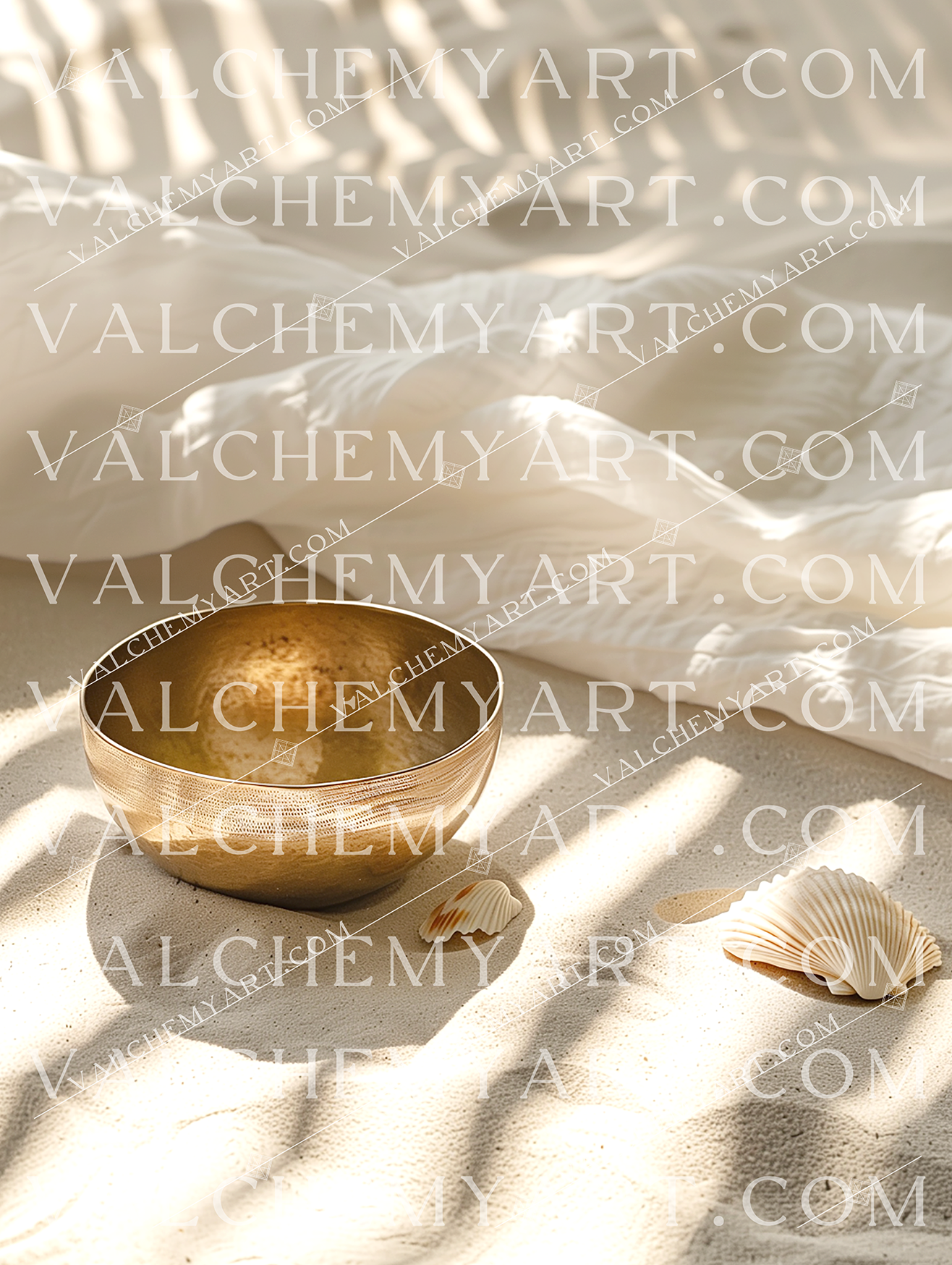 A golden sound bowl rests beside seashells and soft white fabric, bathed in warm sunlight and gentle shadow play.