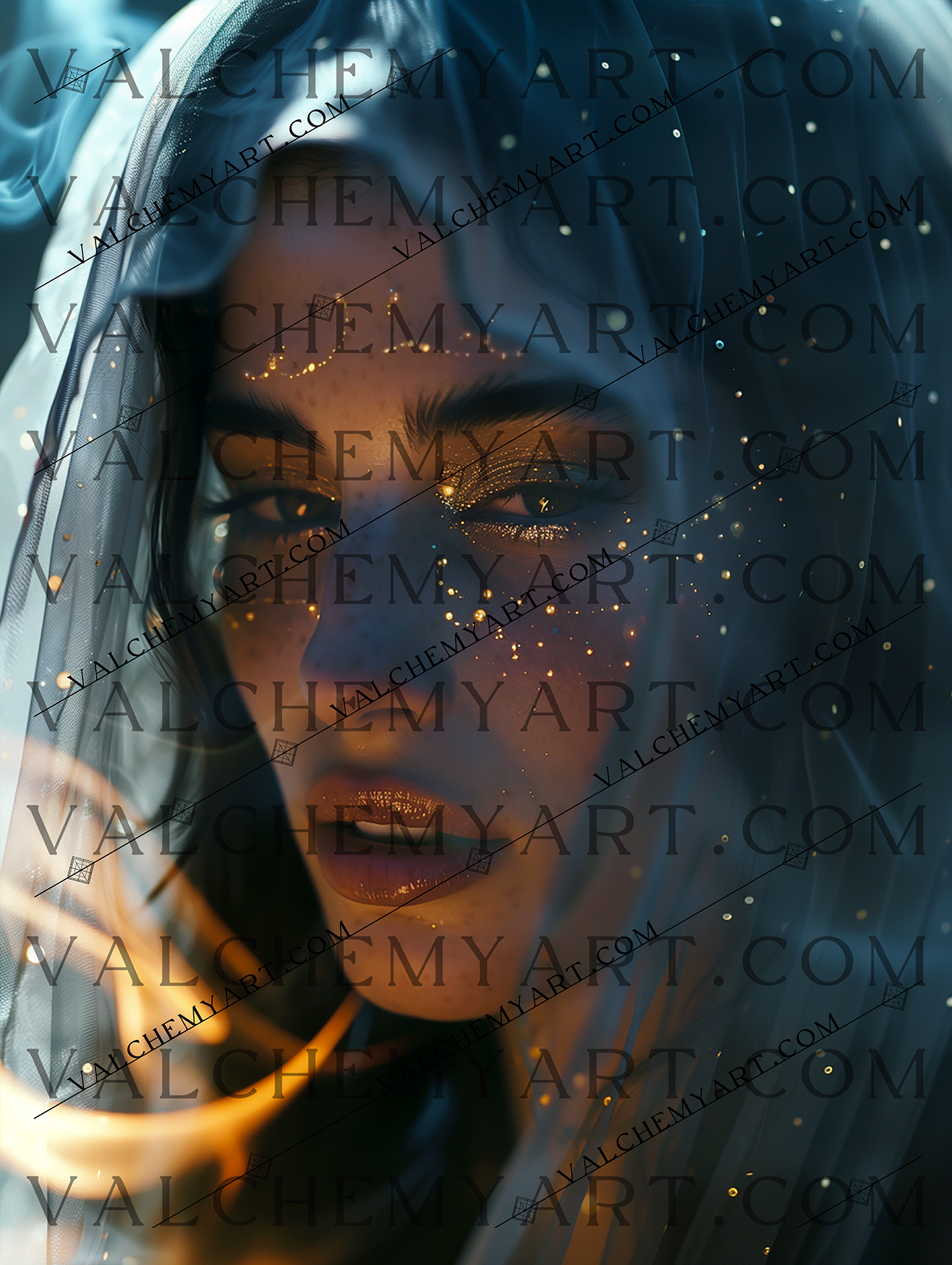A sacred close-up infused with firelight, glowing gold makeup, and celestial detailing. Her gaze pierces through a sheer veil dusted with stars, evoking mysticism, warmth and divine radiance.