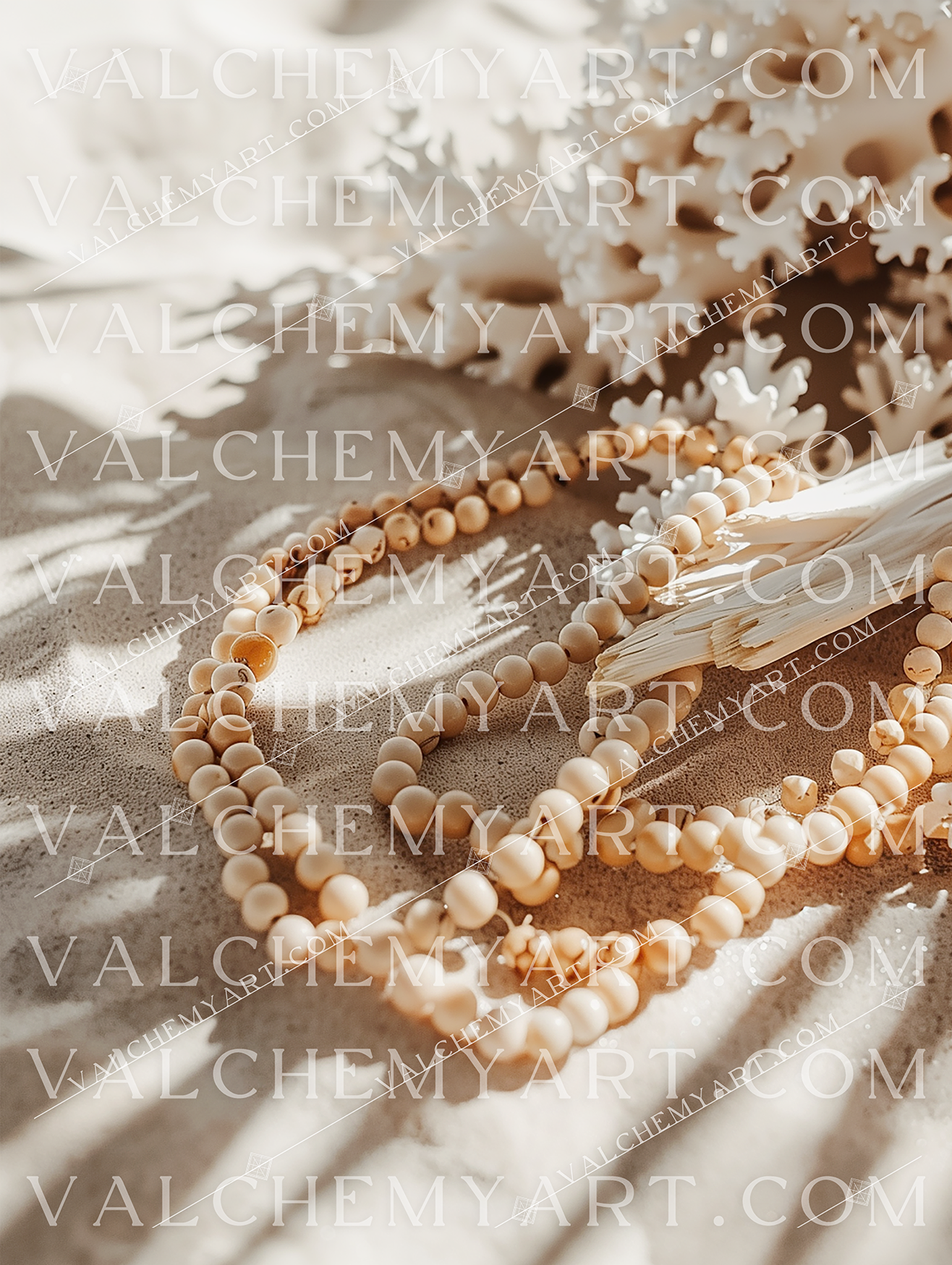 Sun-warmed mala beads lie in soft curves across textured sand, beside bleached coral and palo santo. A serene still life channelling coastal prayer and quiet ritual.