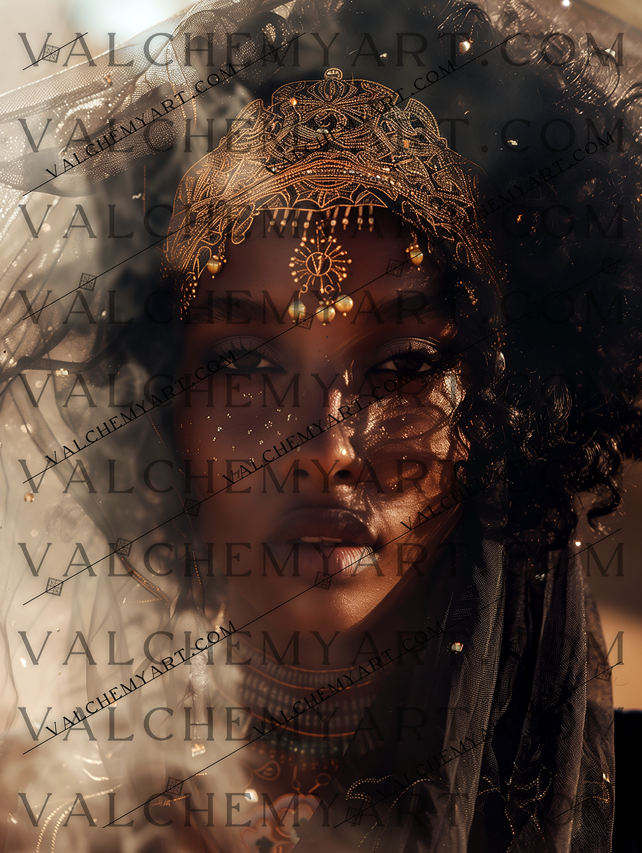 A radiant portrait of a woman adorned in a golden embroidered headpiece and sheer veil, her skin dappled with celestial light. She gazes through a haze of soft smoke, embodying divine strength and mystic grace.