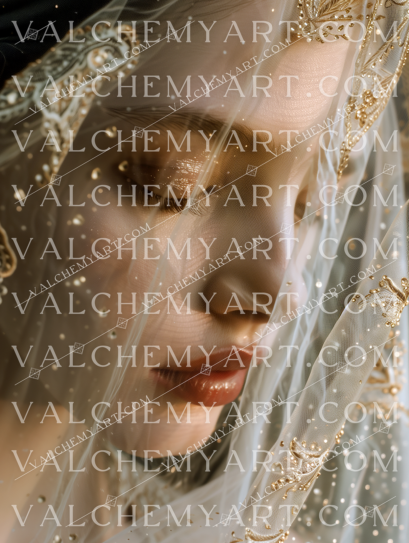 A softly lit side profile of a veiled woman, eyes closed in serene contemplation. Embroidered gold threads shimmer across the translucent fabric, evoking sacred stillness and divine elegance. Perfect for mystical branding, priestess imagery and sacred product promotion.